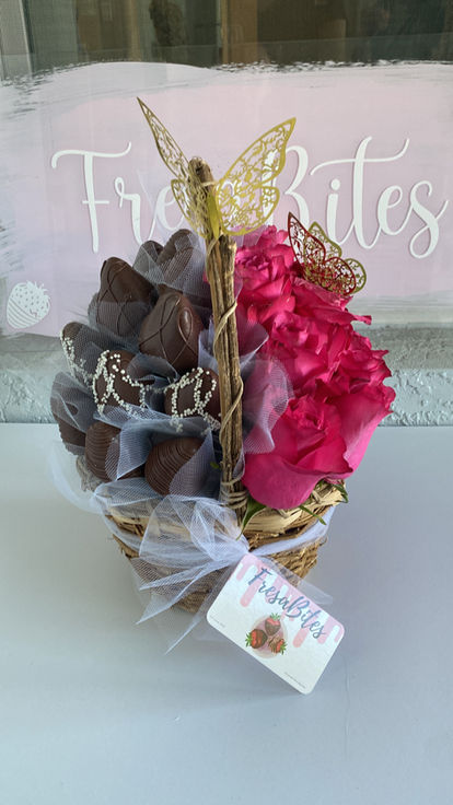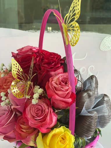 Our rose arrangements bring together two classic symbols of love: chocolate-dipped strawberries and roses. Each arrangement includes 12 delicious strawberries dipped in chocolate, perfectly matched to the color of the roses, along with 12 stunning roses. We design each arrangement to be elegant and beautiful, making it a special gift for any occasion. You can choose from different options like boxes, baskets, or bouquets.